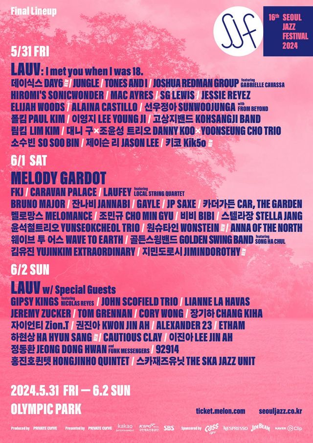 ‘서울 재즈 페스티벌 2024(이하 서재페)’에서 초여름 분위기를 만끽해보는 건 어떨까요? 3일간 59팀이 공연을 펼치는 서재페, 라우브(Lauv)와 멜로디 가르도(Melody Gardot)가 헤드라이너로 이름을 올렸는데요. 이례적으로 5월 31과 6월 2일, 양일간 헤드라이너를 맡은 라우브는 각각 다른 세트 리스트를 준비해서 팬들의 기대감을 높이고 있어요. 데이식스는 6년 만에 서재페에 출연하며 2024 그래미 수상자 레이 베이, 차세대 팝스타 알레이나 카스티요 등이 처음으로 내한하고요. 여기에 바이올리니스트 대니구와 재즈 피아니스트 조윤성 트리오의 합동 무대와 잔나비, 비비, 장기하, 권진아, 윤석철트리오 등 국내 뮤지션들의 무대까지 놓치지 마세요!