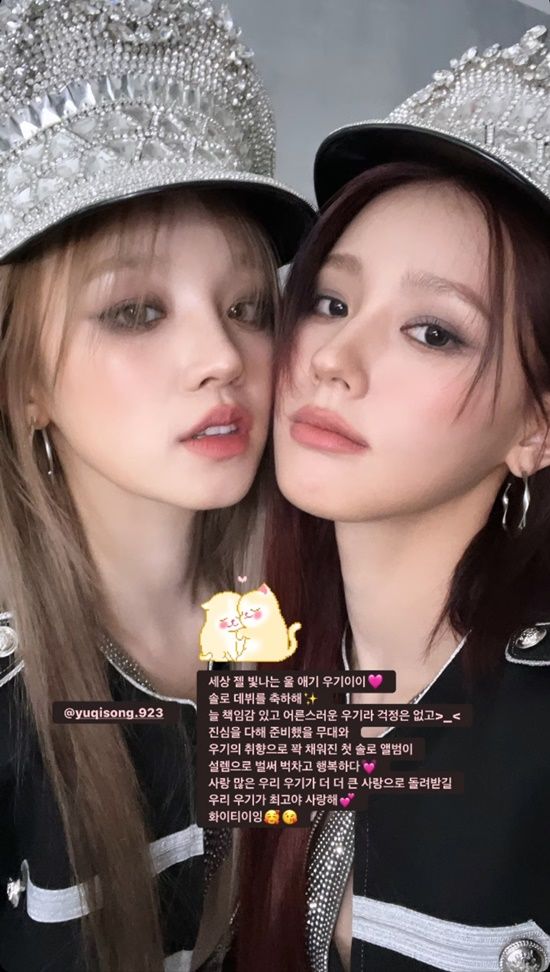 공개 된 사진 속 미연과 우기는 'Super Lady' 활동 중 쓰던 모자를 쓰고 볼을 맞대고 다정한 모습이다.