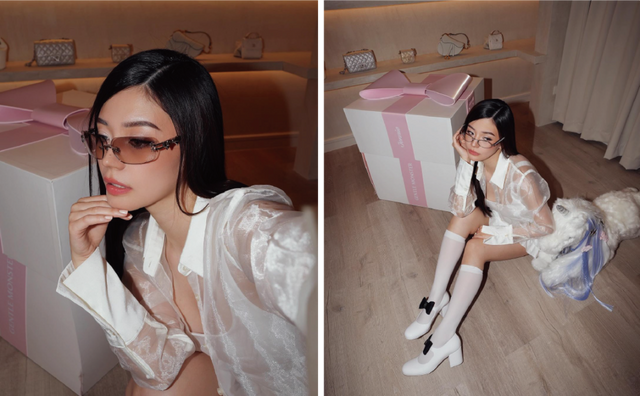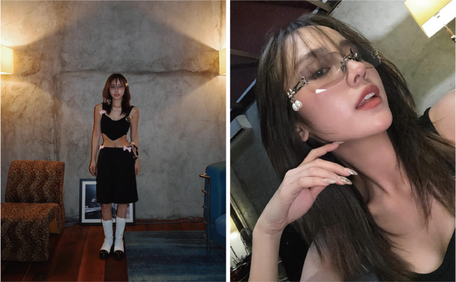 아이웨어와 참뿐만 아니라 유니콘의 헤어 장식까지 활용한 Jestinna Kuan. 브라운 그라디언트 렌즈의 선글라스와 펄 드롭 참으로 발레코어 무드를 완성시켰습니다.