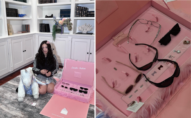 제니는 인스타그램을 통해 가장 먼저 젠틀 살롱 컬렉션을 선공개했는데요. 사랑스러운 선물 박스를 열면 유니콘 인형과 함께 열쇠를 건네줍니다. 열쇠로 개봉한 핑크 퍼 박스 속에는 4개의 선글라스와 1개의 안경, 그리고 아이웨어 템플을 취향대로 꾸밀 수 있는 11개의 참으로 구성되어 있는데요. 이번 컬렉션에서는 총 6개의 아이웨어가 출시 될 예정입니다.