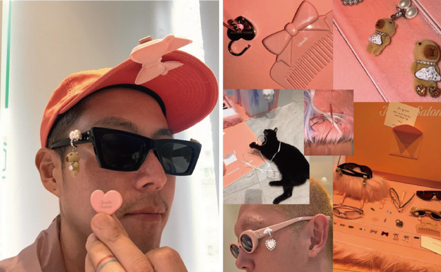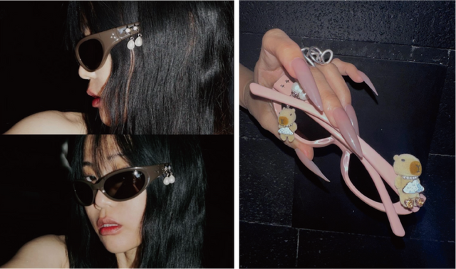 수많은 화보에서 제니의 네일을 담당하는 네일 아티스트 박은경. 브라운 컬러의 고글형 선글라스에 펄 드롭 참을 달아 무심한듯 시크한 매력을 담았습니다. 양쪽에 카피바라 참을 꽂은 핑크 컬러 선글라스는 이번 컬렉션의 러블리함을 가장 잘 표현한 조합이죠.