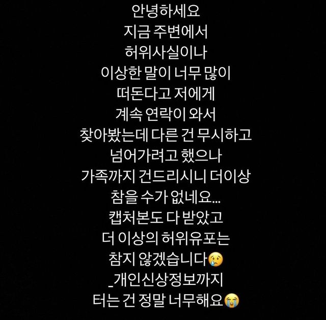 지금 주변에서 허위 사실이나 이상한 말이 너무 많이 떠돈다고 저에게 계속 연락이 와서 찾아봤는데 다른 건 무시하고 넘어가려고 했으나 가족까지 건드리시니 더이상 참을 수가 없네요.