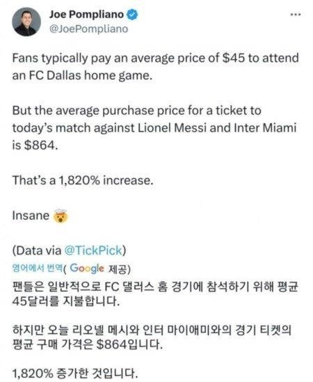 MLS클럽 댈러스는 오늘 마이애미와 1경기로 230억 매출 올림