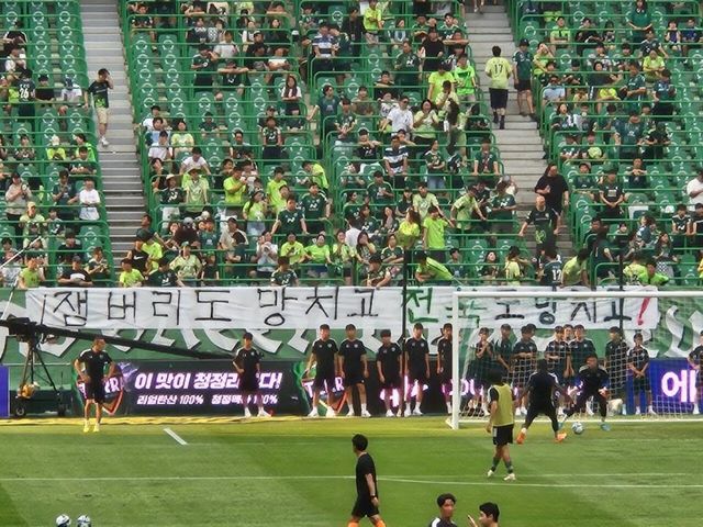 잼버리 K팝 공연을 전주월드컵경기장에서 한다는 소리를 듣고 분노한 전북현대 팬들이 항의걸개 걸었음[1]