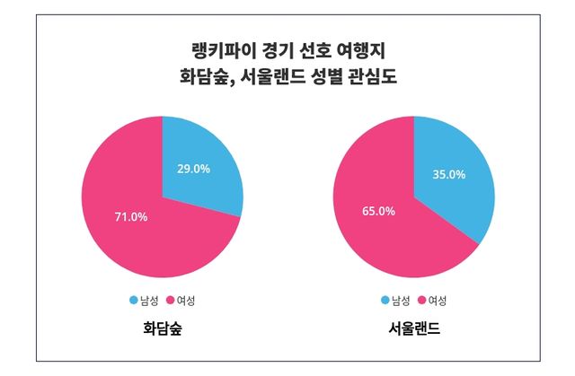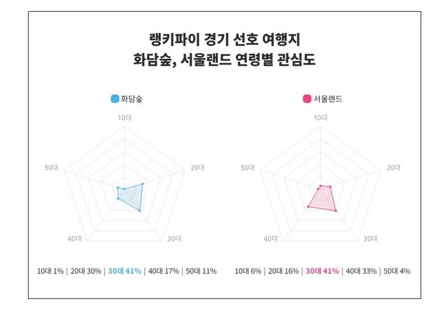 또한 성별 관심도에서도 화담숲은 '여성'에게 '71%'로 높은 관심을 받았고, 서울랜드는는 '여성'에게 '65%'의 지지를 받고 있다는 점이 분석됐다.