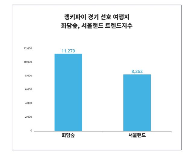 화담숲은 '11,279포인트'로 선두를 달리고 있으며, 서울랜드가는 '8,262포인트'를 기록하며 뒤를 잇고 있다. 이 둘의 트랜드지수 차이는 '3,017포인트'로 나타났다.