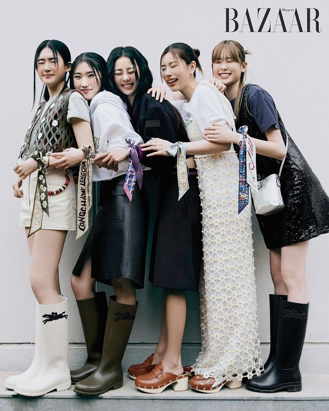 (왼쪽부터) 유로가 착용한 톱은 44만원대, 쇼츠는 57만원, 레인부츠는 37만원, 유진이 착용한 원피스는 44만원대, 티셔츠는 24만원, ‘로조 박스 XS’ 버킷 백은 76만원, 레인부츠는 37만원, 소연이 착용한 원피스는 44만원대, 티셔츠는 24만원, 레인부츠는 37만원 모두 Longchamp, 다빈이 착용한 스웨트셔츠는 44만원대, 시퀸 맥시 드레스는 1백28만원, ‘로조 박스 XS’ 버킷 백은 76만원, 재스민이 착용한 후디는 48만원대, 시퀸 드레스는 1백28만원, ‘로조 에센셜 S’ 호보 백은 63만원.