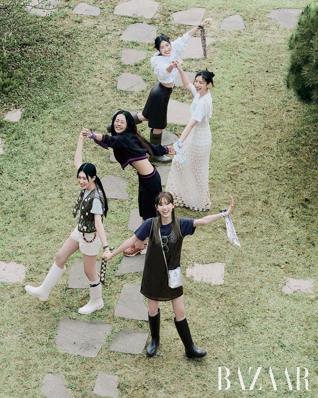 (왼쪽부터) 유로가 착용한 컷아웃 가죽 베스트는 3백4만원, 크로셰 톱은 39만원, 티셔츠는 24만원, 쇼츠는 47만원대, 스카프는 19만원, 쇼츠에 달아 연출한 스트랩은 33만원대, 레인부츠는 37만원, 소연이 착용한 후디는 48만원대, 가죽 스커트는 1백72만원, 스카프는 19만원, 레인부츠는 37만원, 유진이 착용한 보머 재킷은 76만원, 버뮤다 팬츠는 67만원, 스카프는 19만원, 클로그는 96만원, 재스민이 입은 크로셰 드레스는 1백31만원, 티셔츠는 24만원, 스카프는 19만원, 클로그는 1백22만원, 다빈이 착용한 시퀸 원피스는 93만원, 티셔츠는 24만원, 스카프는 19만원, ‘로조 XS’ 크로스 보디 백은 55만원, 레인부츠는 37만원 모두 Longchamp.