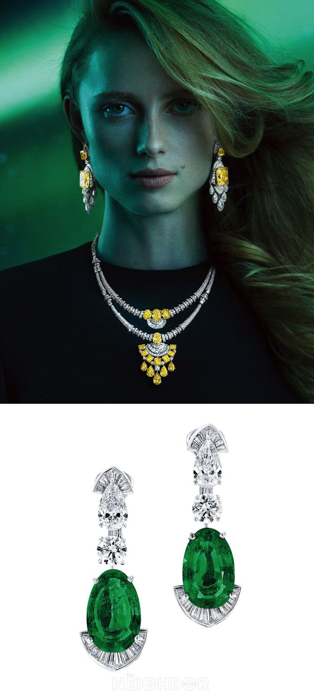 그라프 하우스는 끊임없는 변화를 기념하는 캠페인 ‘갤럭시아(Galaxia)’를 공개했다. 밤하늘의 영원한 아름다움에서 영감 받아 탄생한 갤럭시아는 그라프와 깊이 공명하는 컬러이자 우주를 닮은 그린 컬러가 돋보이는 캠페인으로, 은하수를 배경으로 톱모델 리앤 반 롬페이가 그라프의 찬란한 하이 주얼리를 착용한 모습을 담고 있다. 캠페인 속 진귀한 젬스톤을 보는 것 자체로 색다른 즐거움을 준다. 사진 속 리앤은 트라이벌 컬렉션 제품을 착용한 모습이다. 총 89.92캐럿에 달하는 다양한 커팅의 옐로 다이아몬드 및 화이트 다이아몬드를 장식한 네크리스, 총 65.81캐럿의 옐로 다이아몬드·화이트 다이아몬드를 세팅한 이어링이 강렬하다. 이 밖에도 총 11.93캐럿 콜롬비아산 에메랄드 2개와 총 5.07캐럿 멀티 셰이프 다이아몬드를 세팅한 이어링 등 대담하고 화려한 주얼리들이 시선을 사로잡는다.