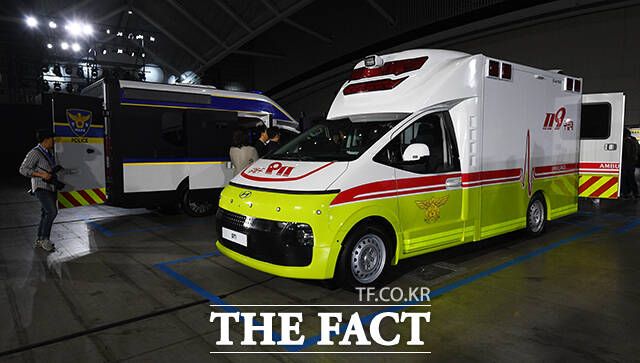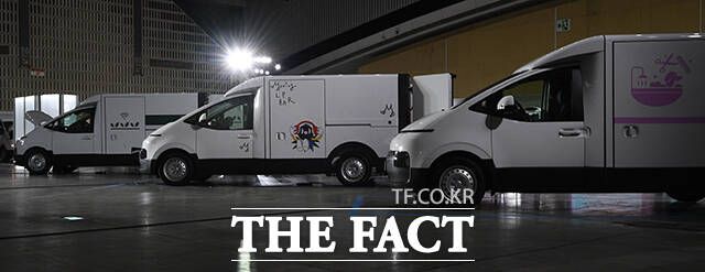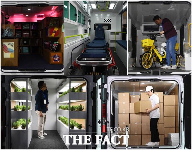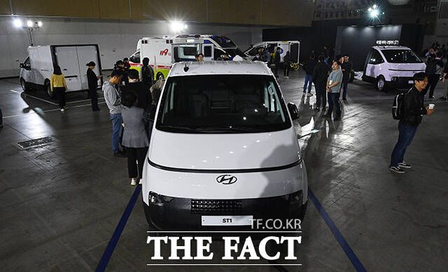 23일 오전 인천 연수구 송도컨벤시아에서 현대자동차 ST1의 신차발표회가 열린 가운데 다양한 사양이 적용된 ST1이 전시돼 있다. 왼쪽 위 시계방향으로 LP전시 차량, 구급차, 전기바이크 충전차량, 스마트 팜 차량, 택배차량. /인천=이동률 기자