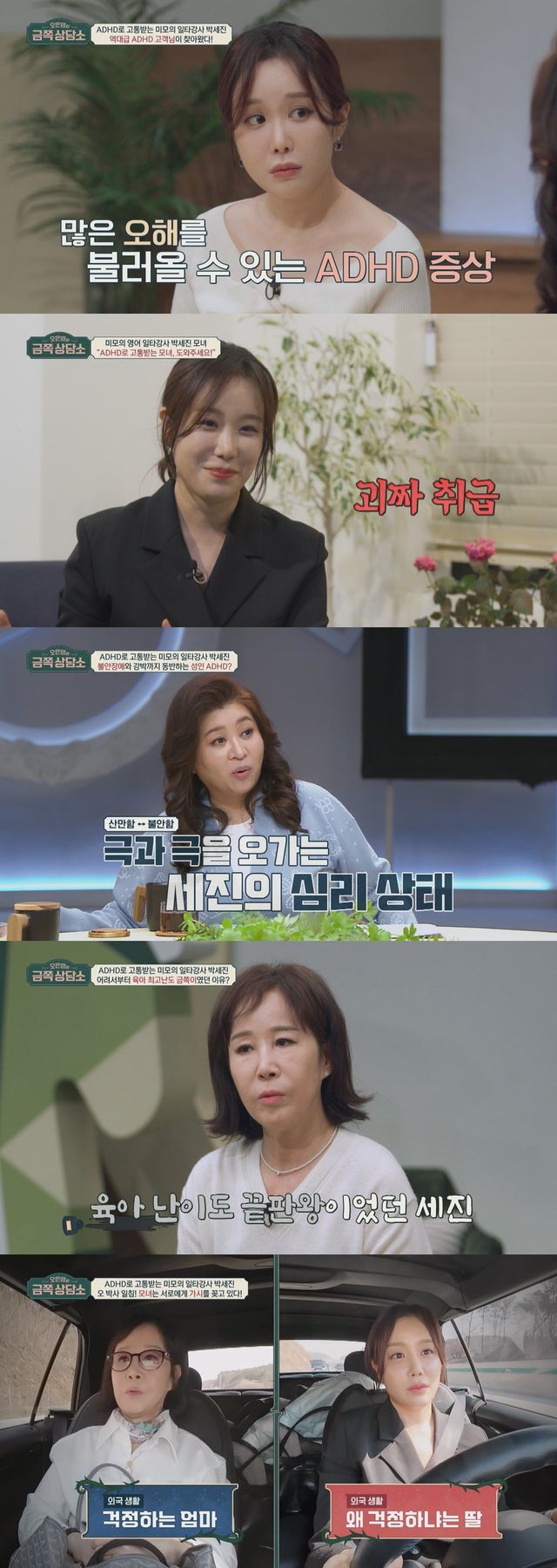 박세진은 등장부터 일본어, 불어, 영어 3개 국어로 자기소개를 하는가 하면, 누구나 쉽게 배울 수 있는 족집게 강의로 상담소 식구들을 열혈 제자로 만들었다는 후문이다. 이날 박세진, 이향남 모녀는 “ADHD로 고통받는 저희 모녀, 어떻게 해야 할까요?”라는 반전 고민과 함께, 일타강사의 치명적인 비밀을 고백한다. 박세진은 “아침에 제시간에 일어나고, 날씨에 맞게 옷을 입는 등 일상생활조차 어려운 ADHD를 앓고 있고, 하루 10알 이상의 약을 복용하고 있다”라고 토로한다. 이에 엄마 이향남은 “어린 시절부터 산만한 것은 기본이고, 샤프심을 입으로 물어뜯는 등 남들은 하지 않는 행동을 했다”라며 딸의 증상을 첨언한다.