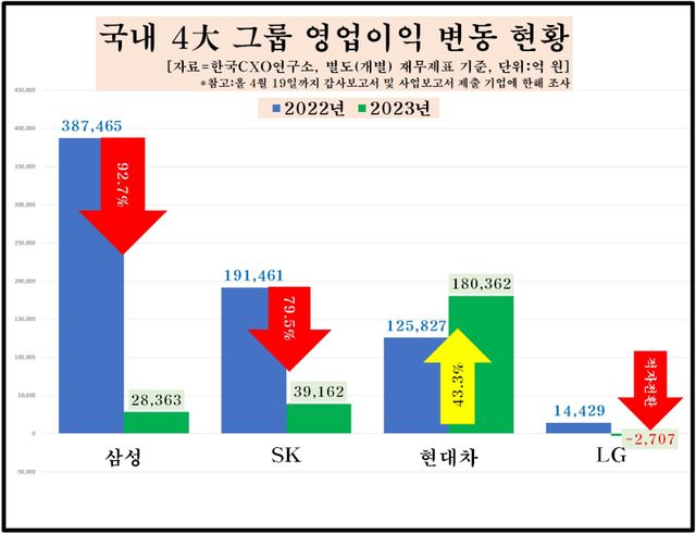 24일 기업분석전문 한국CXO연구소에 따르면 지난 19일까지 감사·사업보고서를 제출한 국내 4대 그룹 주요 국내 계열사 306곳의 2022∼2023년 별도(개별) 재무제표 기준 영업이익 변동 현황을 분석한 결과, 이들 기업의 지난해 영업이익 총액은 24조5180억원으로 집계됐다. 이는 2022년(71조9182억원) 대비 65.9% 감소한 것으로 1년 새 47조4000억원가량이 증발한 셈이다.
