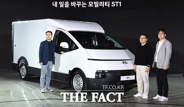 23일 인천 연수구 송도컨벤시아에서 현대자동차 ST1의 신차발표회가 열린 가운데 정유석 현대자동차 국내사업본부 부사장을 비롯한 관계자들이 ST1과 함께 포토타임을 갖고 있다. 왼쪽부터 정 부사장, 민상기 현대자동차 PBV사업실 실장, 오세훈 현대자동차 PBV Development실 상무. /인천=이동률 기자