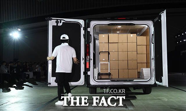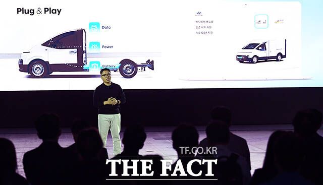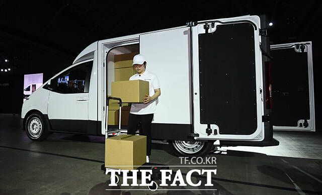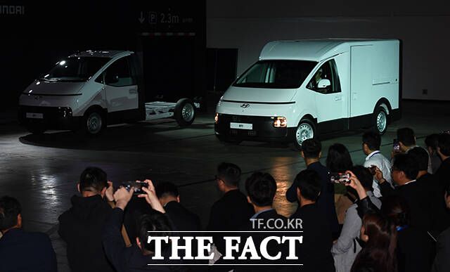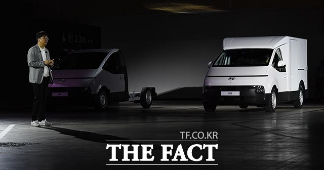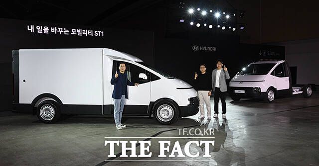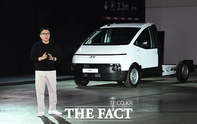 [더팩트ㅣ인천=이동률 기자] 정유석 현대자동차 국내사업본부 부사장을 비롯한 관계자들이 23일 인천 연수구 송도컨벤시아에서 열린 ST1 신차발표회에 참석해 차량을 소개하고 있다.