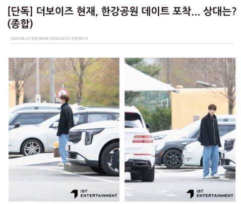 게시글은 마치 연예 매체가 유명인의 열애설을 보도하는 듯한 기사 형식을 띄고 있었다. 함께 첨부된 사진에는 더보이즈 멤버 영훈과 현재가 몰래 찍힌 듯한 파파라치 컷이 담겨있었다.