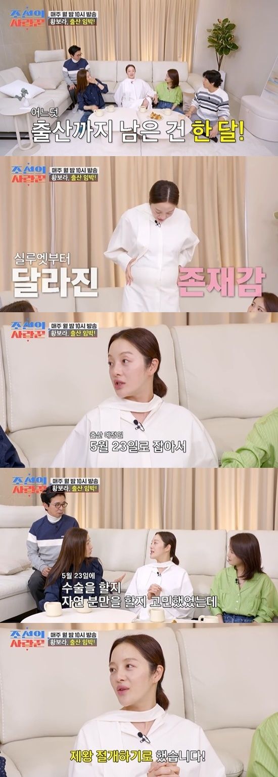 이에 황보라는 바로 일어나 배를 만지며 "지금 제가 배 크기가 이만하다. 출산 예정일을 5월 23일로 잡았다"고 말했다.