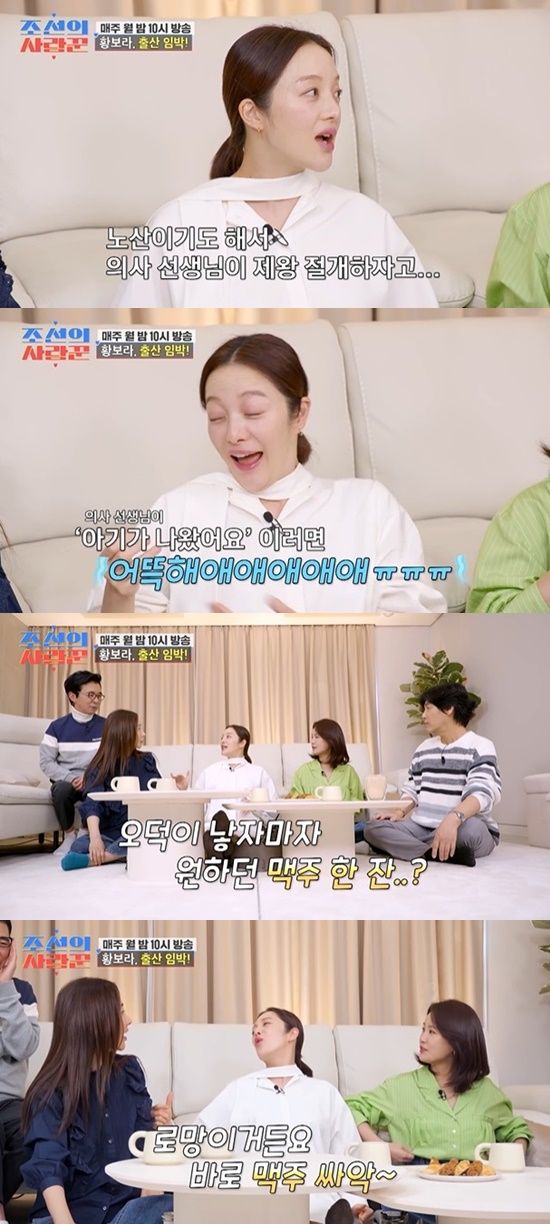 황보라는 김지민이 "오덕이(태명)를 낳자마자 본인이 원하시던 맥주 한 잔 할거냐"고 장난스럽게 묻자 "낳자마자 일주일 정도 병원에 있다가, 산후조리원에 얼른 가서 모유 파이팅을 좀 하고 맥주를 마시고 싶다. 로망이다. 5월 말 되면 날씨도 따뜻할 것 아니냐"라고 말해 김국진과 강수지, 최성국 등 출연진들을 놀라게 만들었다.
