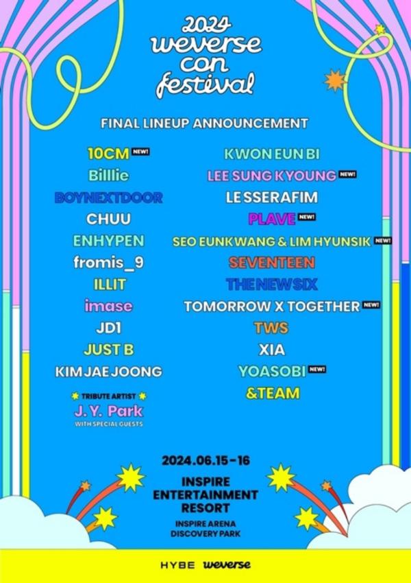이로써 오는 6월 15~16일 인천 인스파이어 엔터테인먼트 리조트에서 막을 열 위버스콘 페스티벌의 24개 팀 라인업이 완성됐다.