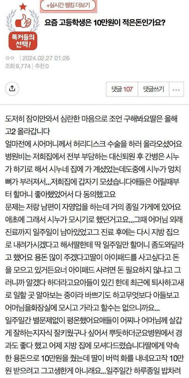 2. 딸이 일주일동안 할머니 밥 차려드리고, 씻겨드리고, 기저귀 갈아드리고, 화장실 뒷처리까지 함