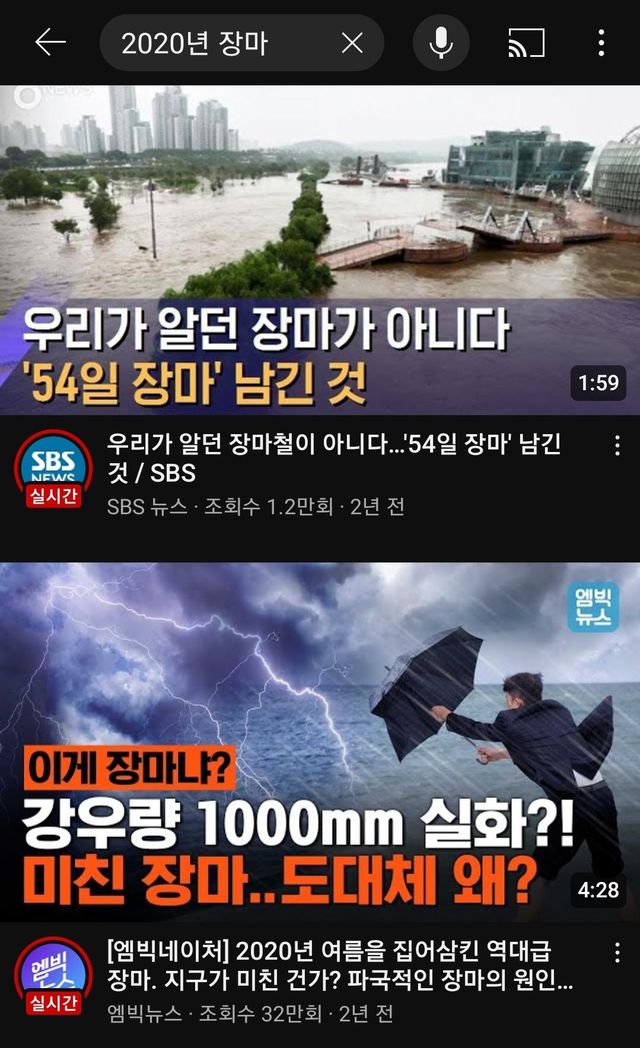 우리나라의 장마는 6월 하순부터 7월 하순까지 한달 정도인데 2020년에는 54일간 장마로 8월 중순까지 비가 왔다