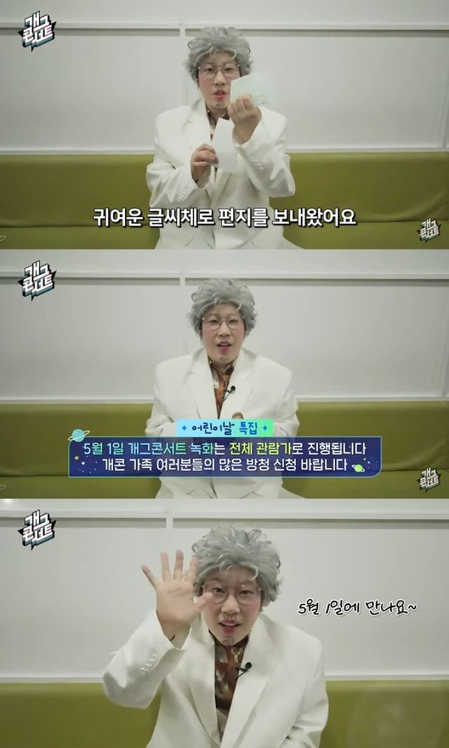 ‘개그콘서트’ 어린이날 특집 녹화는 다음 달 1일 진행된다. 제작진에 따르면 어린이 관객은 약 500명이 올 것으로 예상된다. 녹화 시작 시간도 어린이 관객을 배려해 기존 오후 7시에서 오후 6시로 앞당겼다.