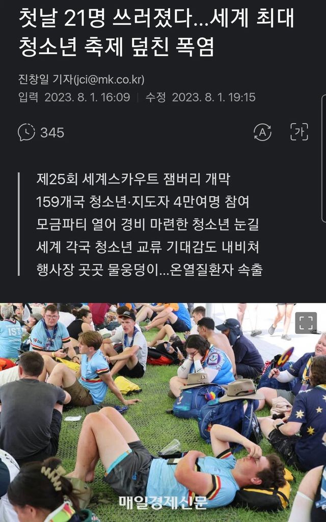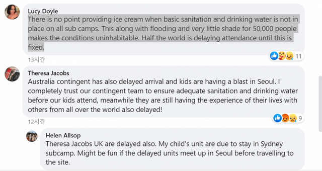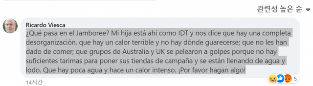 잼버리에서는 어떤 일이 벌어집니까? 내 딸은 IDT로 거기에 있으며 완전히 무질서하고 몹시 덥고 숨을 곳이 없다고 말합니다. 그들이 먹지 않았다는 것; 호주와 영국의 그룹이 텐트를 세울 팔레트가 충분하지 않고 물과 진흙으로 채워져 싸움을 벌였습니다. 물이 적고 매우 뜨겁습니다. 어떻게든 해주세요!