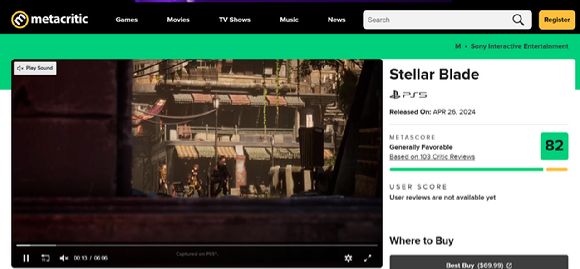 25일 글로벌 비평 사이트 메타크리틱이 공개한 스텔라 블레이드 PS5 버전 메타스코어는 82점을 기록한 것으로 나타났다. 이는 이날 엠바고가 해제되며 공개된 총 103개의 해외 리뷰를 바탕으로 한 것으로 리뷰에 참여한 해외 매체 중 84%가 스텔라 블레이드를 긍정 평가했으며 13%가 복합적으로 판단했다. 부정적으로 본 매체는 한 곳도 없었다. 앞서 P의 거짓이 최초 기록한 메타스코어 역시 82점이다.