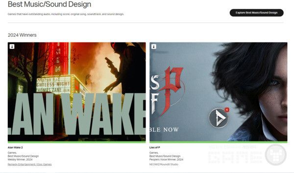 음악/사운드 부문에는 '아토믹 하트', '코쿤', '데드스페이스'가 노미네이트 됐으며 '모노폴리 GO!'. '옥센프리2: 로스트 시그널'이 수상했다. 최우수작으로는 'P의 거짓'과 '앨런 웨이크2'가 선정됐다.
