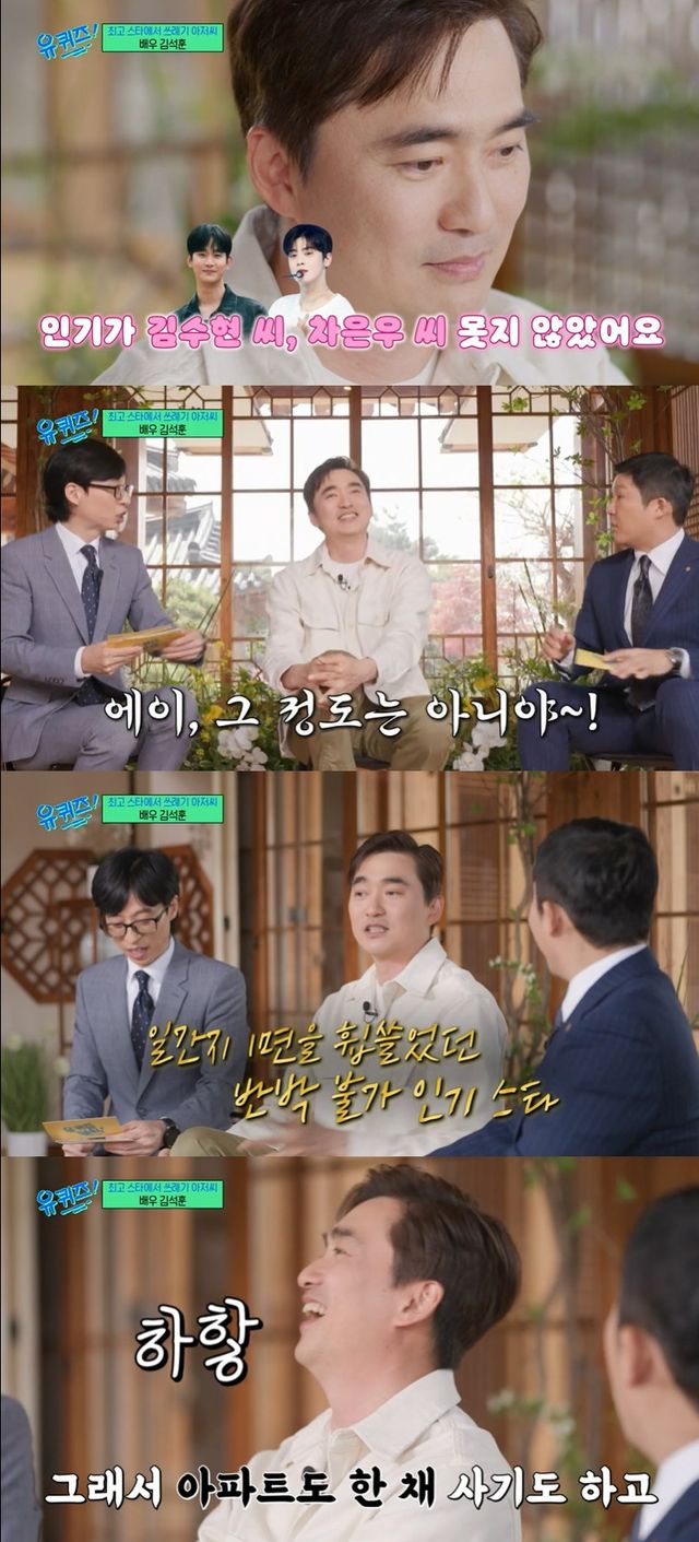 유재석은 "최고 시청률 52.7%까지 기록한 김희선 씨와 함께한 드라마 '토마토'로 그때 당시 김석훈 씨의 인기가 김수현 씨, 차은우 씨 못지 않았다"며 운을 뗐다. 당시 김석훈은 일간지 1면을 휩쓸었던 반박 불가 인기스타였다.