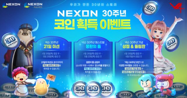 넥슨은 창립 30주년을 기념해 '메이플스토리', 'FC온라인', 'V4'가 릴레이 프로모션을 실시한다.