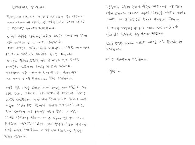 폴킴이 작성한 손 편지 / 폴킴 스토리 홈페이지