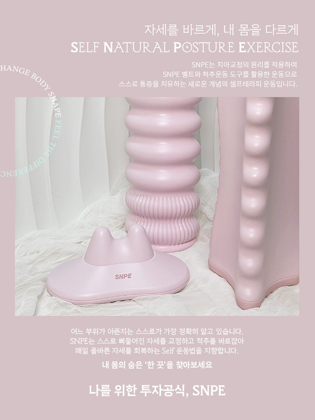 SNPE는 바른 자세를 기본으로 하는 올바른 라이프 스타일 브랜드다. 자신의 몸에서 느껴지는 불편함이나 통증을 스스로 교정하고 회복하는 셀프 운동법을 지향한다.