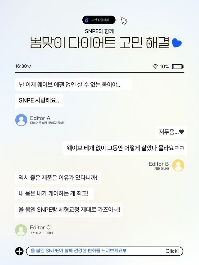 더 이상 다이어트를 내일로 미룰 수 없는 시기! 건강을 해치는 무리한 다이어트 대신, 집에서도 쉽고 간편하게 할 수 있는 SNPE 바디케어 제품으로 올봄엔 더 예뻐지는 건 어떨까?