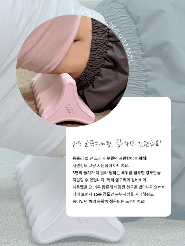 [SNPE 웨이브에펠] 웨이브에펠은 굳어있는 옆구리 근육에 특화된 마사지 도구다. 3면의 다양한 돌기로 초보자부터 숙련자까지 모두 사용할 수 있고 조각칼로 깎아내듯 압도적인 바디 컨투어링 효과를 느낄 수 있는 허리/골반 맞춤형 제품이다.