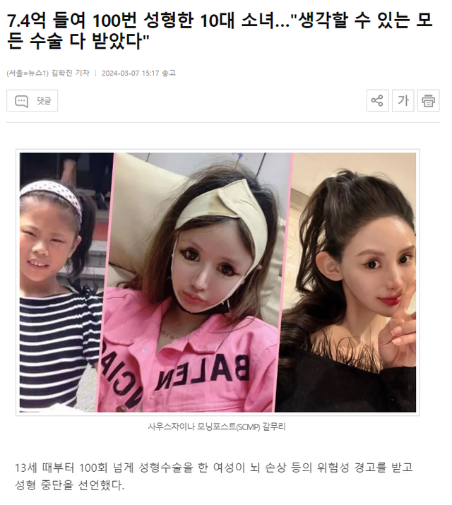 학창 시절부터 외모에 대한 불안과 우울감을 느껴온 그는 열등감을 극복하기 위해 코 성형, 가슴 수술 등에 400만 위안(한화 7억 4000만원)을 들여 100회 이상의 성형수술을 받았다.