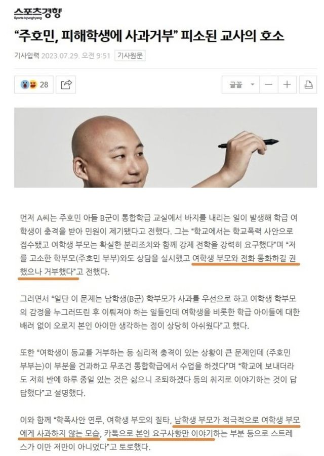 피해자 부모와 전화통화 거부 , 사과 하는둥 마는둥