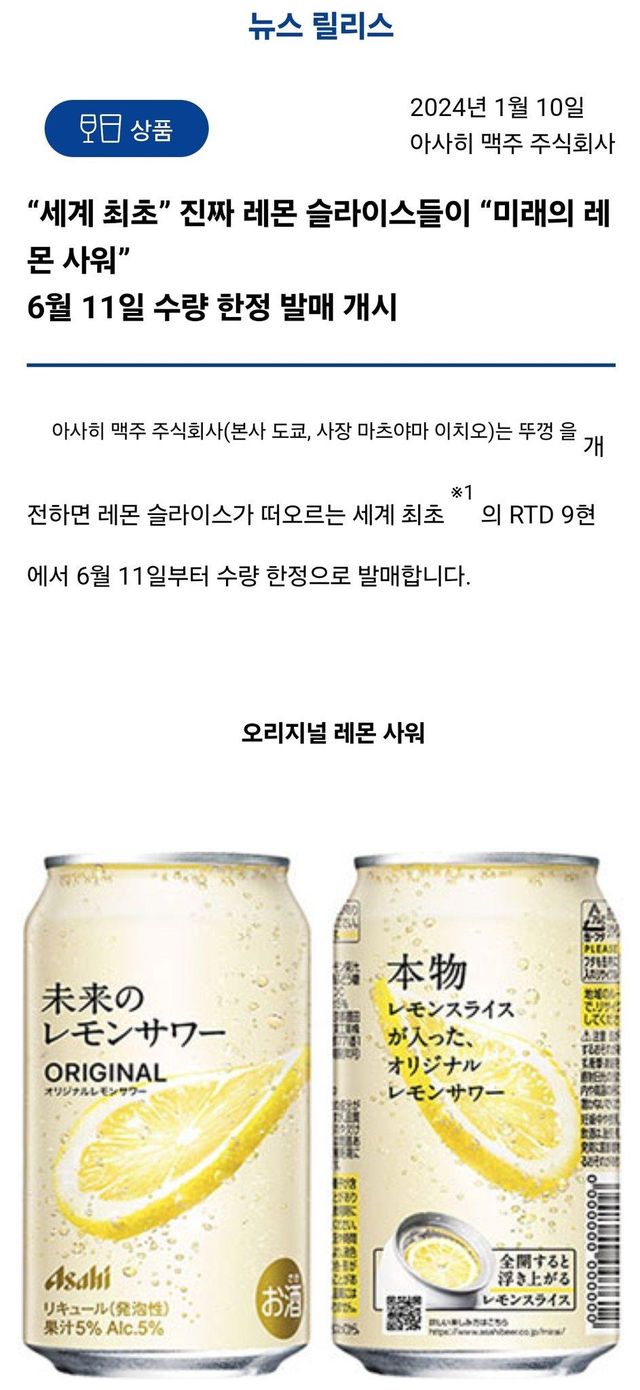 아사히에서 세계최초라며 생래몬 슬라이스가 들어간 하이볼에 대해