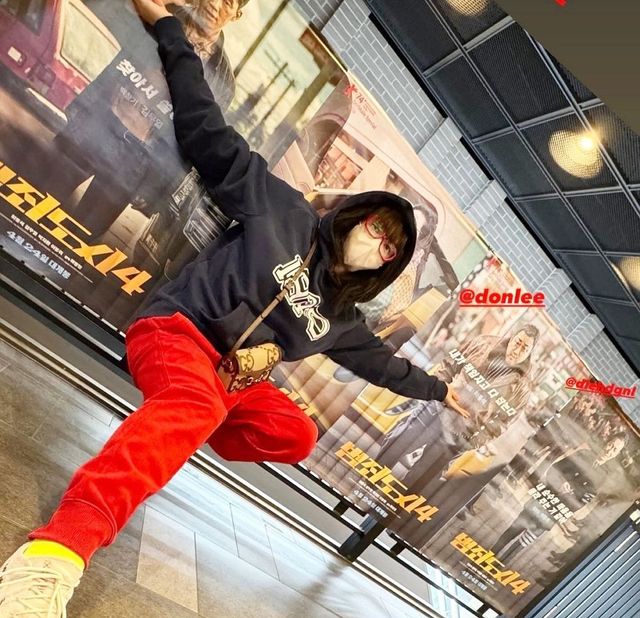 공개된 사진 속 김혜수는 ‘범죄도시4’ 포스터 앞에서 다양한 포즈를 취했다. 그는 빨강 뿔테안경과 마스크, 그리고 후드티에 달린 모자를 착용해 얼굴을 숨겼으나, 우월한 미모를 뽐냈다.