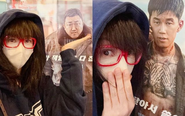 사진에서 김혜수는 포스터에 그려진 마동석의 얼굴을 손으로 받쳐주는 모션을 취하거나 김무열 포스터 앞에서 손으로 입을 가리며 귀여운 매력을 발산했다.