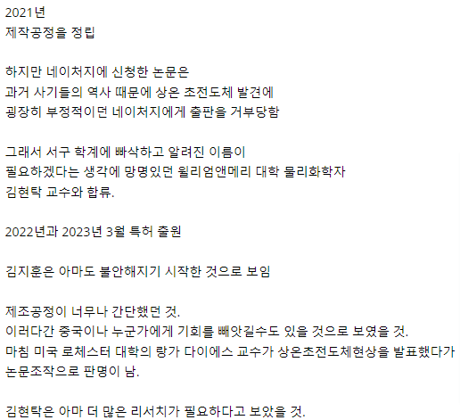 이석배 퀀텀에너지연구소 대표”우리는 연구기관이 아니라 기업이다보니 기술개발의 결과물로 특허를 내고 수익도 내야 하는데, 네이처나 사이언스는 너무 시간이 오래 걸려서 조금 더 논문을 내기 쉬운 루트를 선택한 것뿐이다. 지금은 작고한 최동식 고려대 화학과 교수와 함께 1990년대 중반부터 상온 초전도체 구현을 위해 20년에 걸쳐 연구와 실험을 진행했다.