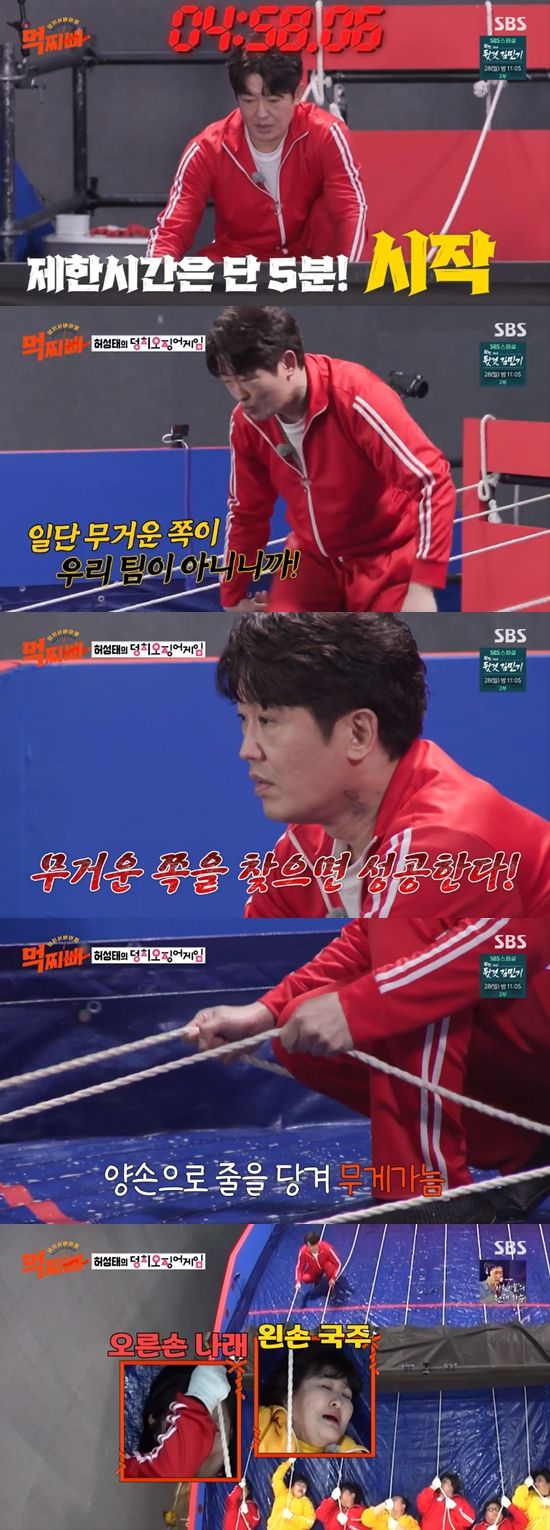 이어 '덩치의 촉' 게임에서 허성태는 줄에 매달린 덩치들의 무게를 가늠해 상대 팀 덩치들의 줄을 끊어야 하는 미션에 도전했다.
