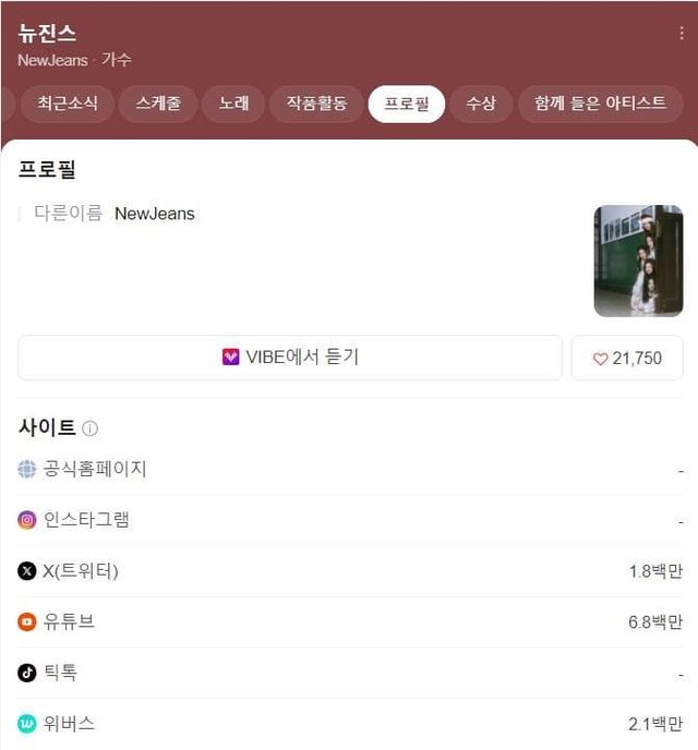 현재 뉴진스의 프로필에 기재된 건 '다른 이름 NewJeans'라는 내용뿐이다.