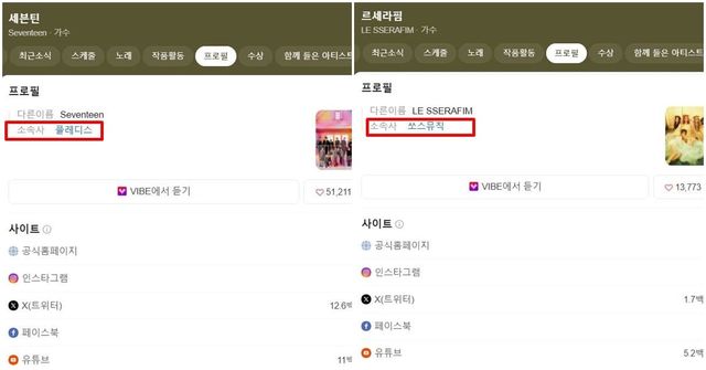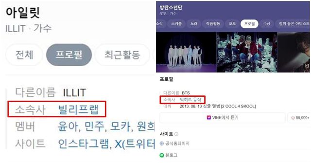 반면 하이브 소속의 그룹 방탄소년단이나 세븐틴, 르세라핌, 아일릿의 네이버 프로필에는 문제가 없다. 이들의 프로필에 소속사는 '빅히트 뮤직', '플레디스', '빌리프랩', '쏘스뮤직' 등 정상적으로 기재돼 있다.