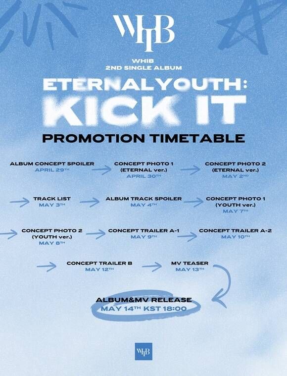 휘브의 두 번째 싱글 앨범 제목은 'ETERNAL YOUTH : KICK IT(이터널 유스: 킥 잇)'이다. 휘브는 오는 29일 앨범 콘셉트 스포일러를 시작으로 30일과 5월 2일 'ETERNAL' 버전의 콘셉트 포토, 5월 3일 트랙리스트, 4일 앨범 트랙 스포일러, 7일~8일 'YOUTH' 버전 콘셉트 포토, 9일~12일 콘셉트 트레일러, 13일 뮤직비디오 티저를 공개한다.
