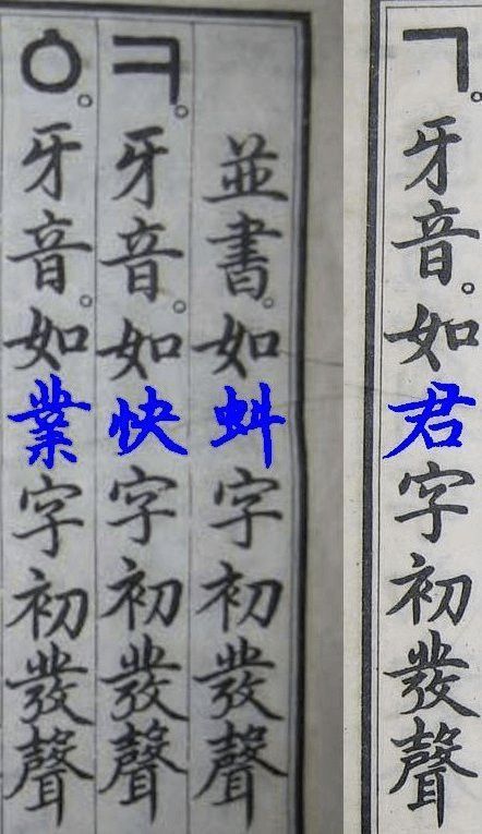 훈민정음 해례본에는 한글 자음 발음을 설명하기 위해 자음 옆에 한자의 예시가 적혀있다.