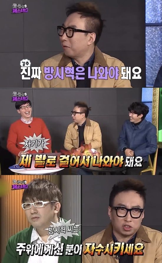 공개된 내용은 지난 2016년 '무한도전'에서 방송된 '못친소(못생긴 친구를 소개합니다) 페스티벌' 특집으로, 당시 출연자 섭외 과정을 말하던 박명수가 방시혁을 언급하며 "진짜 방시혁 씨는 나와야 한다. 자기가 제 발로 걸어서 나와야 한다. 주위에 계신 분이 자수시켜달라"는 내용이 담겨 있다.