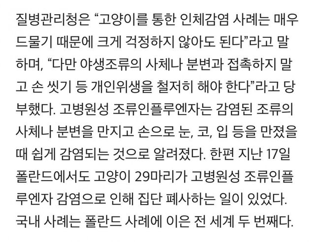 다른 포유류에게 전염 위험성 때문에 당국이 지속적으로 모니터링 예정