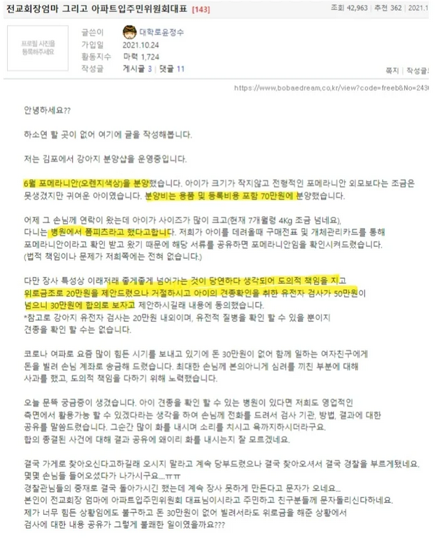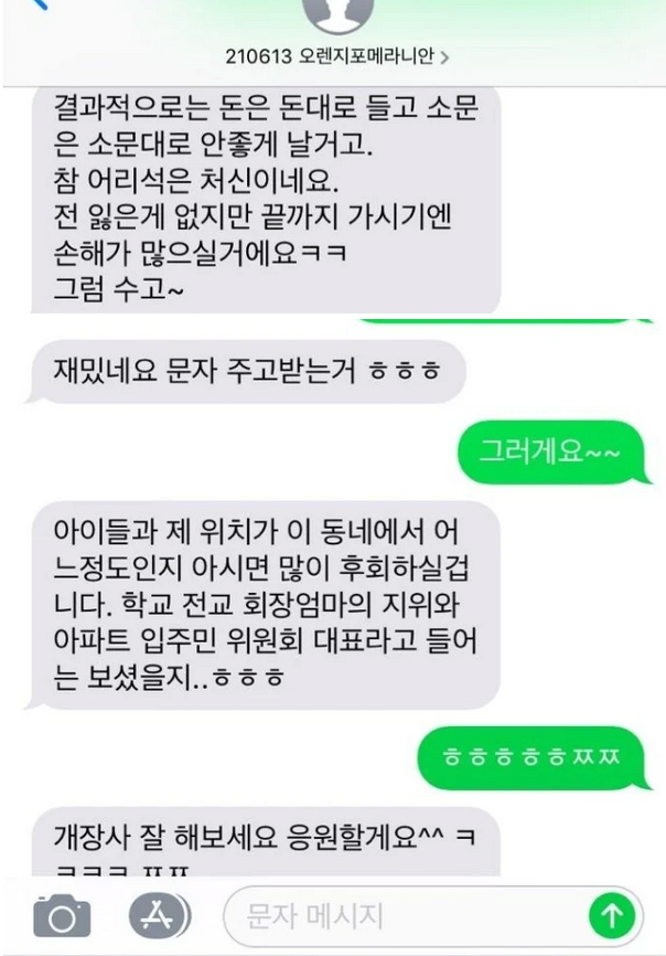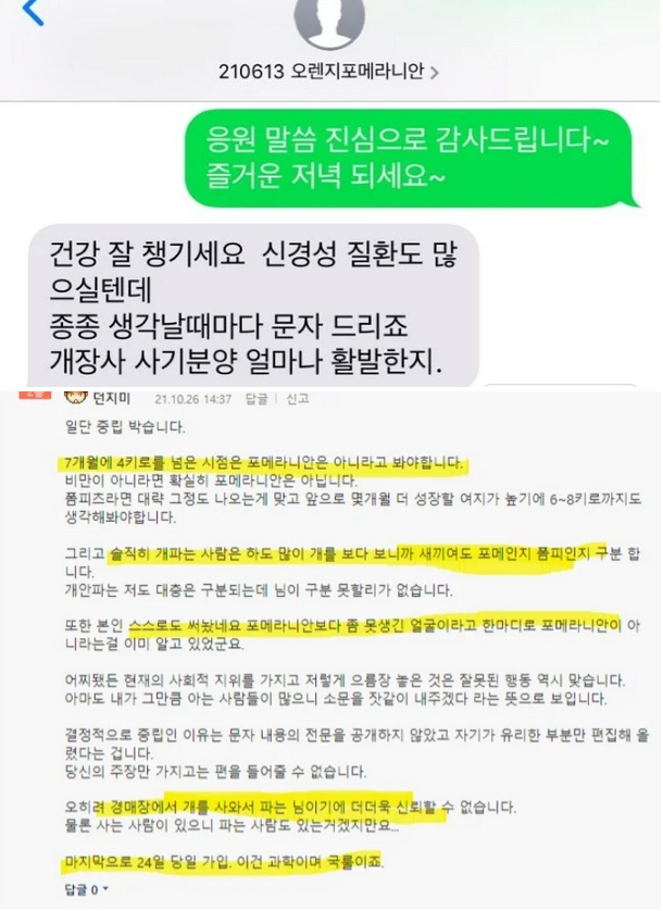 실상은 개팔이가 포메라니안이라고 폼피츠 분양사기치고 피해자 긁다가 받은 문자였음.