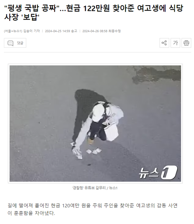 이후 길을 가던 금남고등학교 1학년 양은서 양이 지폐 수십 장이 떨어져 있는 것을 보고 발걸음을 멈췄다. 양 양은 주변을 둘러보며 잠시 고민하다 휴대전화 카메라로 돈을 촬영하고, 쪼그려 앉아 한 장씩 줍기 시작했다.