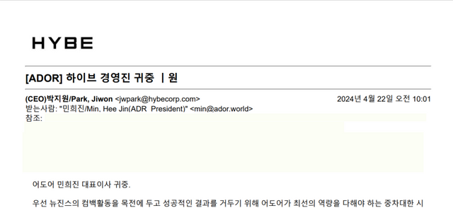 하이브는 26일 공식입장을 통해 “민희진 대표가 지난 25일 기자회견에서 한 발언들에 대해 주주가치와 IP 보호를 위해 사실관계를 정확히 말씀드리고자 한다”며 “당사는 지난 22일 오전 10시 1분 A4 6장짜리 분량의 상세한 답변을 보냈다. 이를 민 대표가 발송 당일 오후 12시경 답변을 읽은 것도 확인했다. 그러나 민 대표는 입장문에서도, 기자회견에서도 ‘답이 안왔다’고 반복 주장하고 있다”고 증거 화면을 첨부했다.
